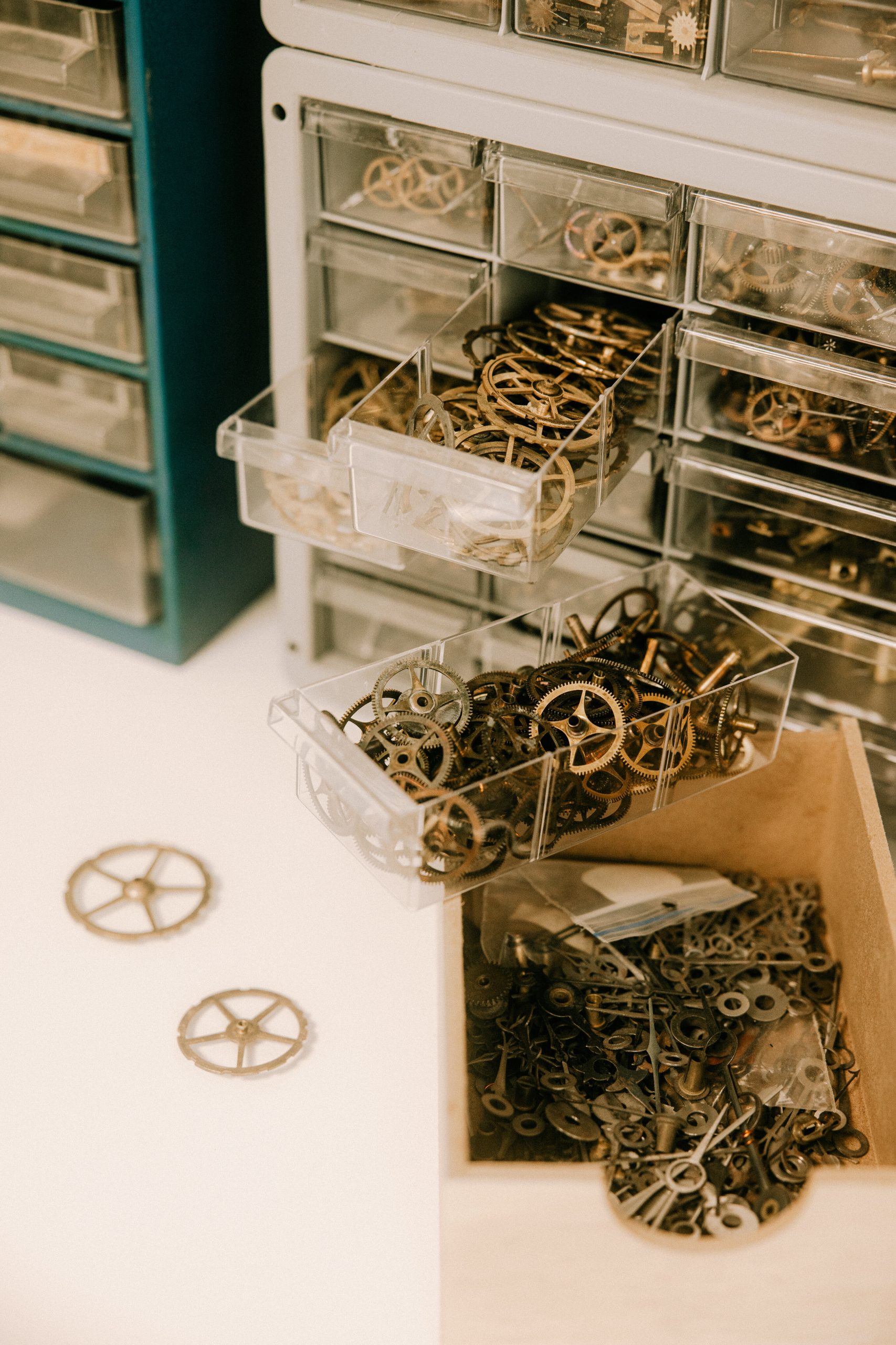C’est ici que sont lavés les mécanismes à l’aide de bacs à ultrasons. Nous y retrouvons également tous les produits et outils nécessaires pour la rénovation des cabinets de pendules.