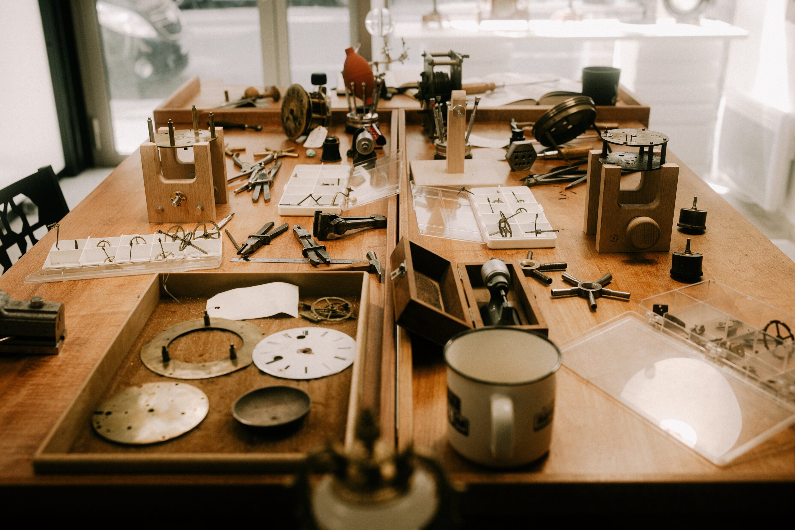 Pour pratiquer la réparation d’horloges anciennes, il est indispensable d’avoir de nombreux outils d’époque.
